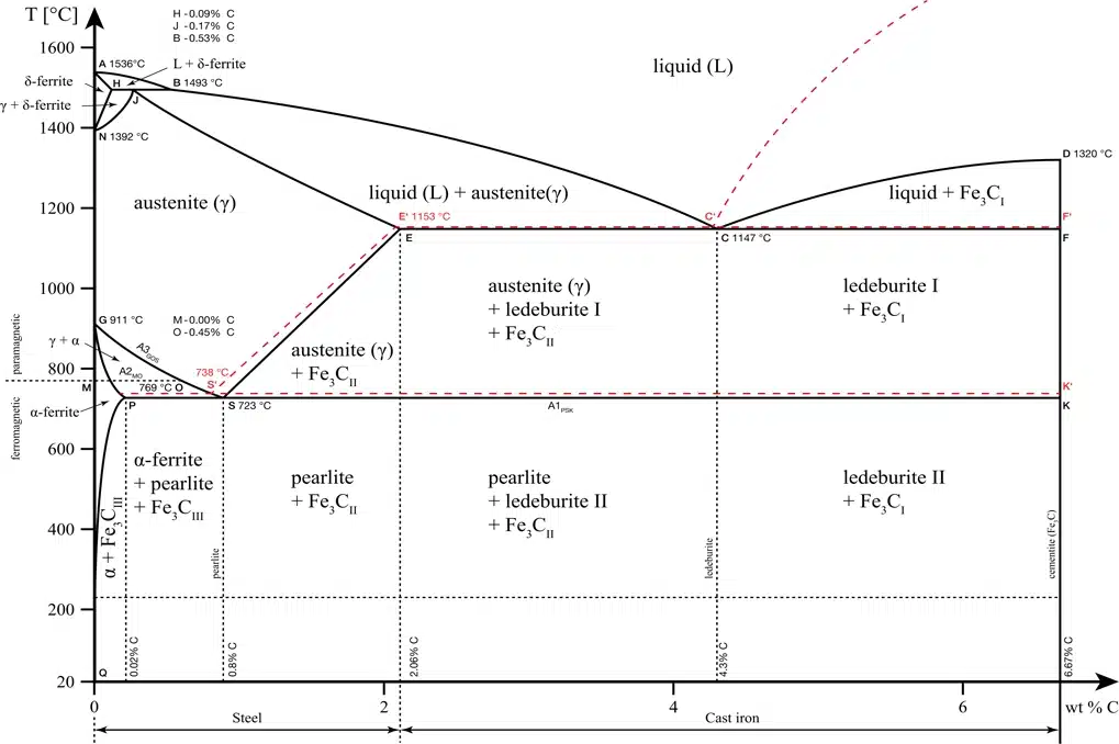 U Fe-C dijagramu, mogu se identifikovati različite oblasti, uključujući austenit, ferit, perlit i cementit. Svaka od ovih faza ima specifične karakteristike koje se koriste u različitim aplikacijama. Na primer, čelik sa visokim sadržajem ugljika ima tendenciju da bude tvrđi, ali manje duktilan, dok čelik sa nižim sadržajem ugljika može biti savitljiviji i lakše obradiv.